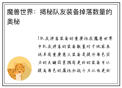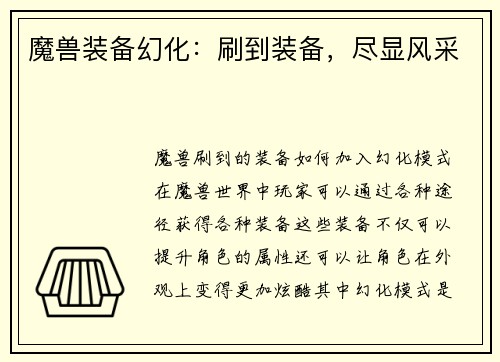 一、什么是阵营装备 在魔兽世界中,阵营装备是指玩家在游戏中可以获得的与特定阵营相关的装备。每个阵营都有独特的装备奖励,这些装备通常具有特殊的属性和效果,可以帮助玩家在游戏中获得更强大的战斗力。查询阵营装备可以帮助玩家了解不同阵营的特点和奖励,以便选择合适的阵营和装备。 二、游戏内查询阵营装备的方式 在魔兽世界中,玩家可以通过多种方式查询阵营装备。以下是几种常见的查询方式: 1. 游戏内手册 魔兽世...
