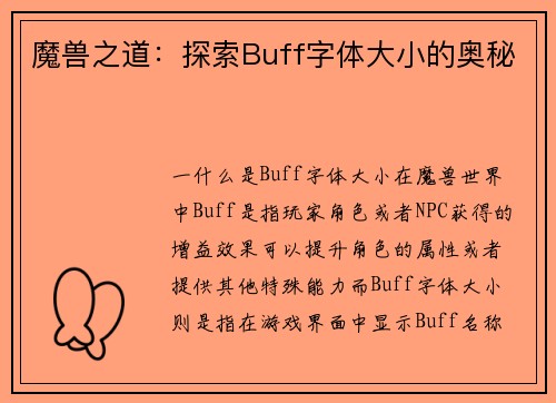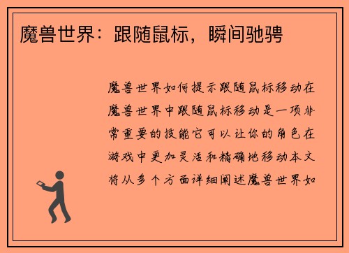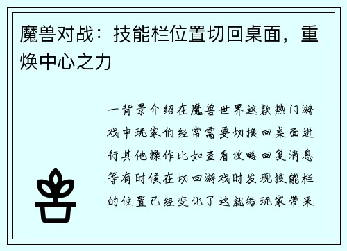 魔兽世界技能栏放中间屏幕的优势 引言: 魔兽世界是一款备受玩家喜爱的大型多人在线角色扮演游戏,它提供了丰富多样的技能和职业选择,使得玩家可以在游戏中体验到自己所选择职业的独特魅力。而将技能栏放在中间屏幕位置,可以带来一系列的优势,使玩家更加方便地使用技能,提高游戏的流畅度和乐趣。 1. 提高操作便捷性 1.1 更直观的视觉反馈 将技能栏放在中间屏幕位置,可以使玩家更直观地了解技能的状态和冷却时间。...